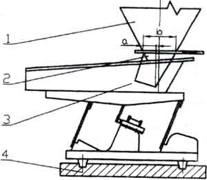 ??電磁振動(dòng)給料機(jī)的振幅和給料量受料倉(cāng)倉(cāng)壓影響較大,設(shè)計(jì)料倉(cāng)時(shí)應(yīng)盡量減少倉(cāng)壓,使溜咀后側(cè)板承受一定的倉(cāng)壓,并設(shè)置斜溜沮及下料閘門(mén)。如圖,一般a=1/4b。溜咀四周應(yīng)與給料槽留有一定的間隙,一般5~10mm,以免產(chǎn)生噪音及影響振動(dòng)。