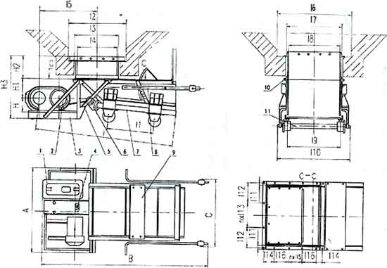 ??1、減速機(jī) 2、電動(dòng)機(jī) 3、傳動(dòng)平臺(tái) 4、聯(lián)軸器 5、H形架 6、連桿 7、給煤槽 8、閘門(mén) 9、機(jī)架 10、漏斗 11、托輥